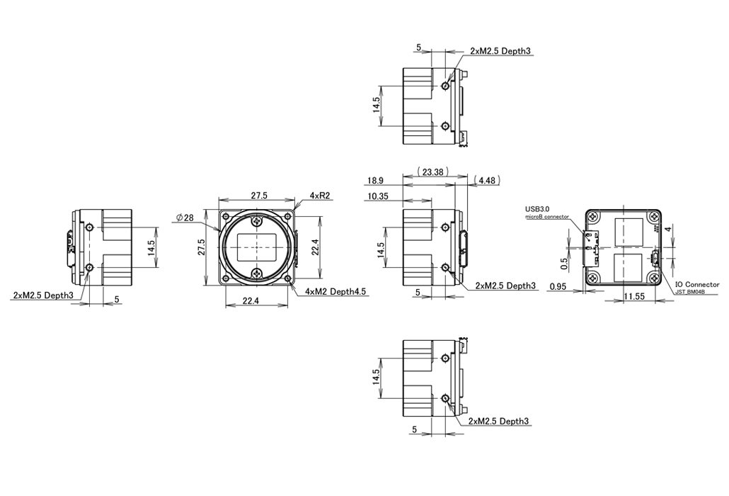 外形寸法 27.5 (W) x 27.5 (H) x 23.38 (D) mm
